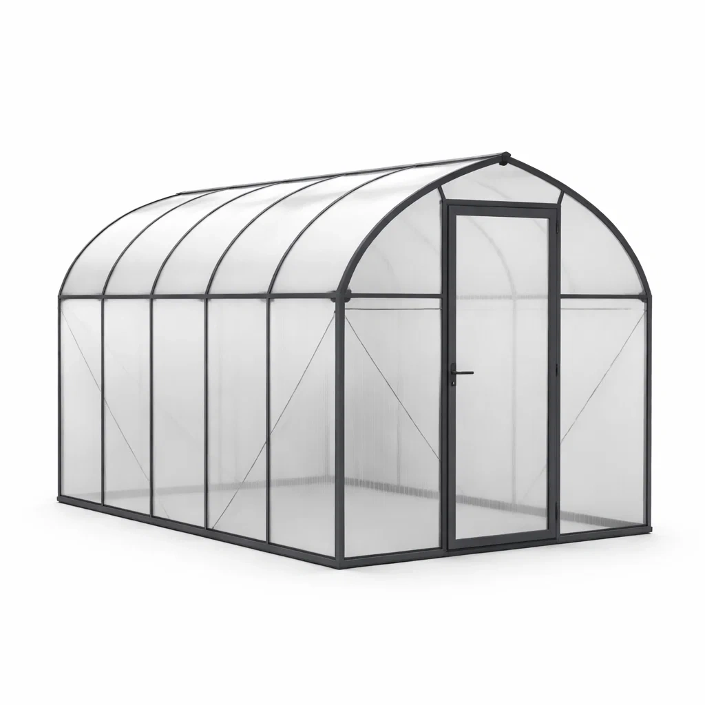 La serre de jardin présente une structure en aluminium et des panneaux en polycarbonate de 4 mm d'épaisseur. Elle mesure 250 cm de longueur, 190 cm de largeur et 195 cm de hauteur. La porte est de type battante. Elle est résistante aux intempéries.