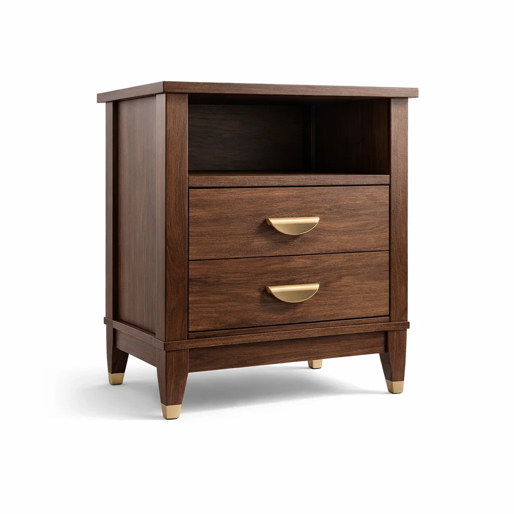 Cette table de chevet est fabriquée en bois massif avec une finition vernie. Elle dispose de deux tiroirs avec des poignées en métal doré. La table mesure 60 cm de long, 40 cm de large et 75 cm de haut. La couleur principale est le Marron, avec des accents Dorés. Le poids net est de 15 kg.